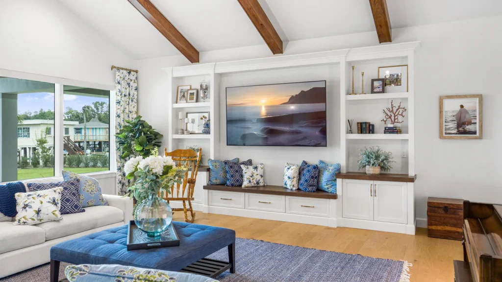 - Built-in shelving and cabinetry can store everything from gaming consoles to DVDs without clutter.